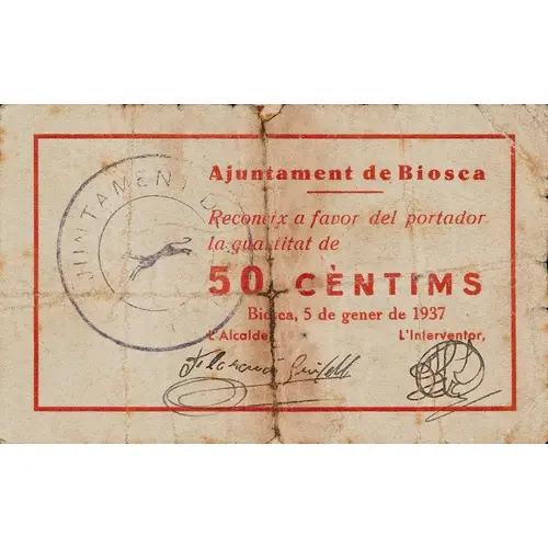 Ajuntament de Biosca Reconeix a favor del portador la quantitat de 50 CÈNTIMS Biosca, 5 de gener de 1937 (Translation: City Council of Biosca Recognizes in favor of the bearer the amount of 50 Centimos Biosca, January 5, 1937) |