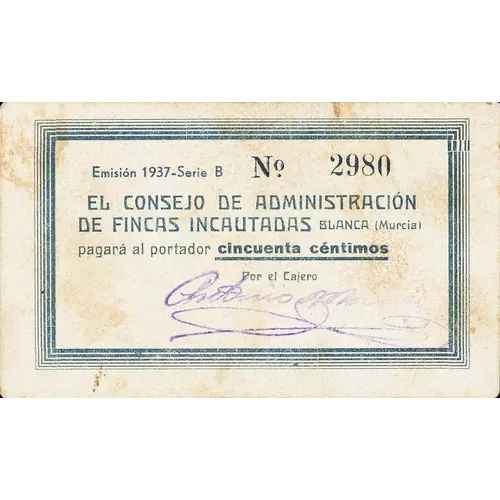 Emisión 1937 - Serie B EL CONSEJO DE ADMINISTRACIÓN DE FINCAS INCAUTADAS BLANCA (Murcia) pagará al portador cincuenta céntimos (Translation: Issue 1937 - Series A The Board of Directors of Seized Properties Blanca (Murcia) Will pay the bearer Fifty Centimos) |