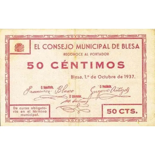 EL CONSEJO MUNICIPAL DE BLESA RECONOCE AL PORTADOR 50 CÉNTIMOS Blesa, 1º de Octubre de 1937. De curso obligatorio en el término municipal. (Translation: The Municipal Council of Blesa Recognizes the bearer 50 Centimos Blesa, October 1, 1937 Mandatory course in the municipality) |