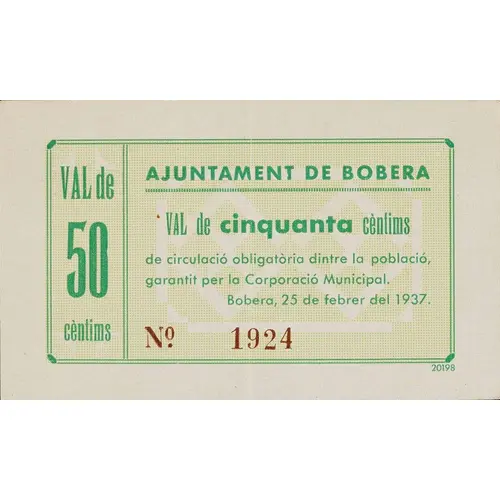 VAL de 50 cèntims AJUNTAMENT DE BOBERA VAL de cinquanta cèntims de circulació obligatòria dintre de la població, garantit per la Corporació Municipal Bobera, 25 de febrer del 1937. (Translation: Voucher of 50 Centimos City Council of Bobera Voucher of Fifty Centimos of mandatory circulation in the town, guaranteed by the Municipal Corporation. Bobera, February 25, 1937) |