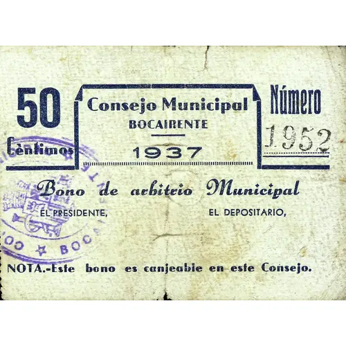 50 Cèntimos Consejo Municipal BOCAIRENTE 1937 Bono de arbitrio Municipal NOTA.- Este bono es canjeable en este Consejo. (Translation: 50 Centimos Municipal Council Bocairente Municipal arbitration bond Note.- This bond is exchangeable in this Council.) |