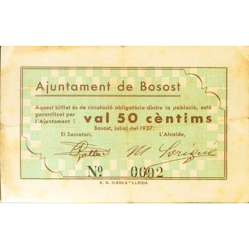 Ajuntament de Bosost Aquest bitllet es de circulació obligatòria dintre de la població, està garantitzat per l`Ajuntament i val 50 cèntims Bosost, juliol del 1937 (Translation: City Council Bosost This banknote is mandatory for circulation within the town, is guaranteed by the City Council and its value is 50 Centimos Bosost, July 1937) |