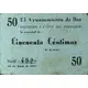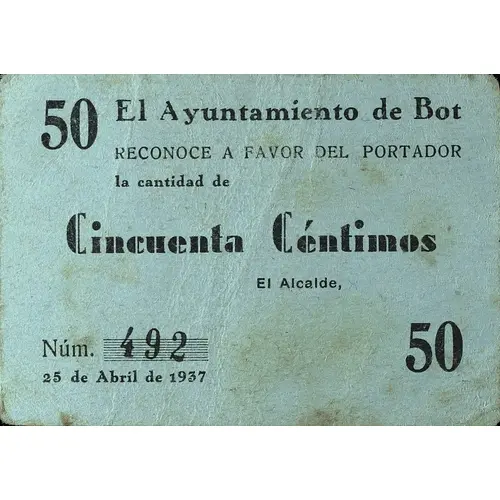 50 El Ayuntamiento de Bot RECONOCE A FAVOR DEL PORTADOR la cantidad de Cincuenta Céntimos 25 de Abril de 1937 (Translation: The City Council of Bot Recognizes in favor of the bearer the amount of Fifty Centimos April 25, 1937) |