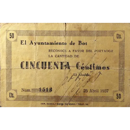 50 Cts. El Ayuntamiento de Bot RECONOCE A FAVOR DEL PORTADOR LA CANTIDAD DE CINCUENTA Céntimos 25 Abril 1937 (Translation: 50 Centimos The City Council of Bot Recognizes in favor of the bearer the amount of Fifty Centimos April 25, 1937) |