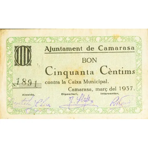 Ajuntament de Camarasa BON Cinquanta Cèntims contra la Caixa Municipal Camarasa, març del 1937. (Translation: City Council of Camarasa Bond Fifty Centimos against the `Caixa Municipal` Camarasa, March 1937.) |