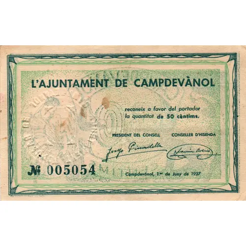 L`AJUNTAMENT DE CAMPDEVÀNOL reconeix a favor del portador la quantitat de 50 cèntims Campdevànol, 1er de Juny de 1937 (Translation: The City Council of Campdevànol recognizes in favor of the bearer the amount of 50 Centimos Campdevànol, June 1, 1937) |