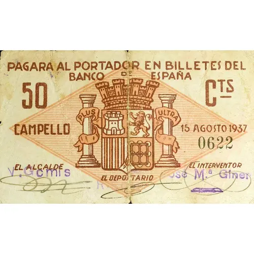 PAGARA AL PORTADOR EN BILLETES DEL BANCO DE ESPAÑA 50 CTS CAMPELLO - 15 AGOSTO 1937 (Translation: Will pay the bearer in banknotes of the Bank of Spain 50 Centimos Campello - August 15, 1937) |