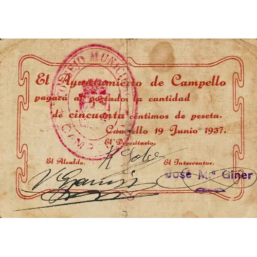 El Ayuntamiento de Campello pagará al portador la cantidad de cincuenta céntimos de peseta. Campello 19 Junio 1937. (Translation: The City Council of Campello will pay the bearer the amount of Fifty Centimos of Peseta. Campello, June 19, 1937.) |