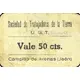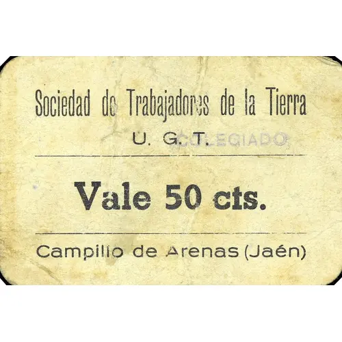 Sociedad de Trabajadores de la Tierra U. G. T. Vale 50 cts. Campillo de Arenas (Jaén) (Translation: Society of Land Workers U. G. T. It is worth 50 Centimos Campillo de Arenas (Jaén)) |