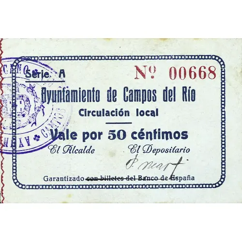 Ayuntamiento de Campos del Río Circulación local Vale por 50 céntimos Garantizado con billetes del Banco de España (Translation: City Council of Campos del Río Local circulation Value for 50 Céntimos Guaranteed with banknotes from the Bank of Spain) |