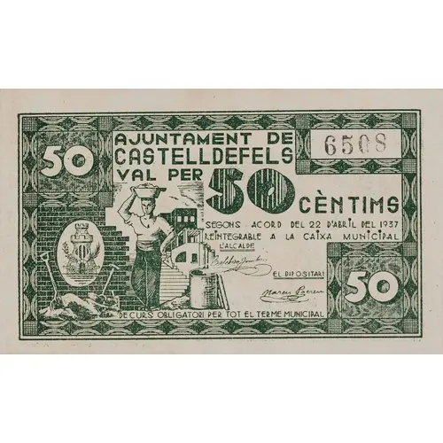 50 AJUNTAMENT DE CASTELLDEFELS VAL PER 50 CÈNTIMS SEGONS ACORD DEL 23 D`ABRIL DEL 1937 REINTEGRABLE A LA CAIXA MUNICIPAL DE CURS OBLIGATORI PER TOT EL TERME MUNICIPAL (Translation: City Council of Castelldefels Valid for 50 Centimos According to agreement of April 23, 1937 Reimbursable to the municipal bank Of mandatory course for all the municipal term) |