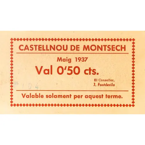 CASTELLNOU DE MONTSECH Maig 1937 Val 0`50 cts. Valable solament per aquest terme. (Translation: Castellnou de Montsech May 1937 Voucher 0.50 Centimos Valid only in this term.) |