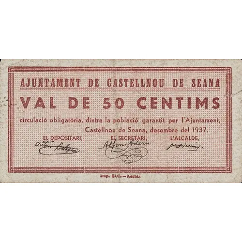 AJUNTAMENT DE CASTELLNOU DE SEANA VAL DE 50 CENTIMS circulació obligatòria, dintre la població garantit per l`Ajuntament. Castellnou de Seana, desembre del 1937. (Translation: City Council of Castellnou de Seana Voucher for 50 Centimos mandatory circulation, within the population guaranteed by the City Council. Castellnou de Seana, December 1937.) |