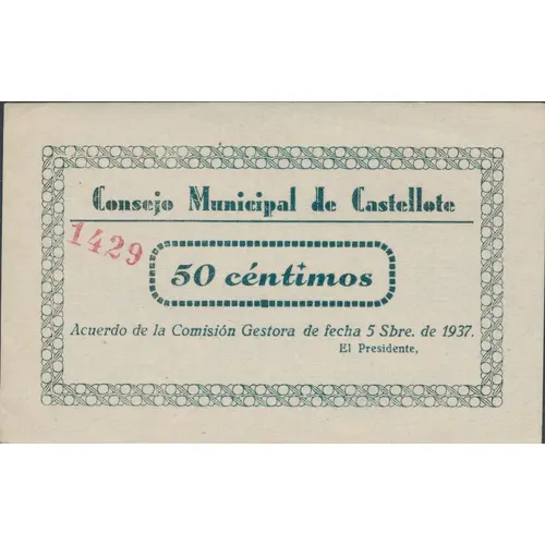 Consejo Municipal de Castellote 50 céntimos Acuerdo de la Comisión Gestora de fecha 5 Sbre. de 1937. El Presidente, (Translation: Municipal Council of Castellote 50 Centimos Agreement of the Managing Commission dated September 5, 1937. The President,) |