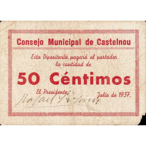 Consejo Municipal de Castelnou Esta Dipositaría pagará al portador la cantidad de 50 Céntimos Julio de 1937. (Translation: Municipal Council of Castelnou This Depositary will pay the bearer the amount of 50 Centimos July 1937.) |