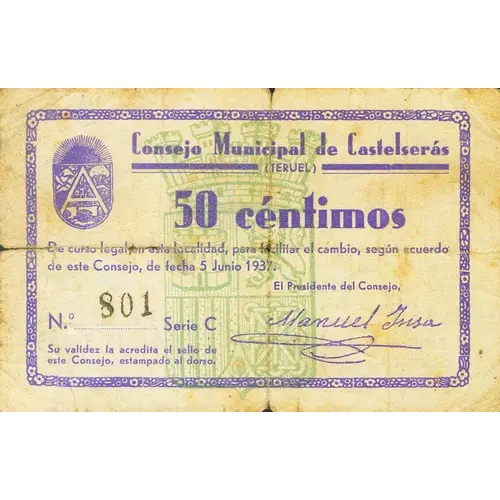 Consejo Municipal de Castelserás (TERUEL) 50 céntimos De curso legal en esta localidad, para facilitar el cambio, según acuerdo de este Consejo, de fecha 5 Junio 1937. Su validez la acredita el sello de este Consejo, estampado al dorso. (Translation: Municipal Council of Castelserás (Teruel) 50 Centimos Legal tender in this locality, to facilitate the exchange, according to the agreement of this Council, dated June 5, 1937. Its validity is confirmed by the seal of this Council, stamped on the back.) |