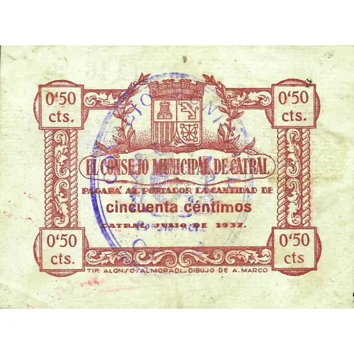 0`50 cts. EL CONSEJO MUNICIPAL DE CATRAL PAGARÁ AL PORTADOR LA CANTIDAD DE cincuenta céntimos CATRAL, JULIO DE 1937. TIP. ALONSO. ALMORADI - DIBUJO DE A. MARCO (Translation: 0.50 Centimos The Municipal Council of Catral Will pay the bearer the amount of Fifty Centimos Catral, July 1937.) |