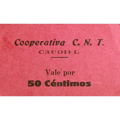 | Legenda del dritto | Cooperativa C. N. T. CAUDIEL Vale por 50 Céntimos (Translation: Cooperative C. N. T. Caudiel Voucher for 50 Centimos) |