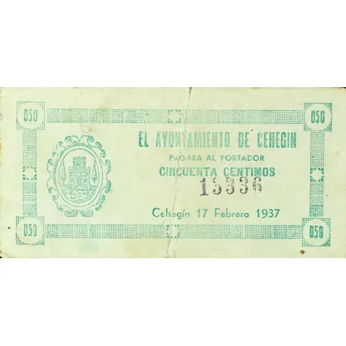 0`50 EL AYUNTAMIENTO DE CEHEGIN PAGARA AL PORTADOR CINCUENTA CENTIMOS Cehegín 17 Febrero 1937 (Translation: The City Council of Cehegín Will pay the bearer Fifty Centimos Cehegín February 17, 1937) |