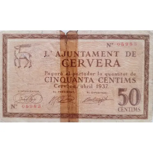 (Translation: The City Council of Cervera Will pay the bearer the amount of Fifty Centimos Cervers, April 1937 50 Centimos)