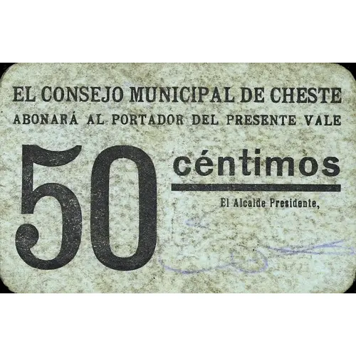EL CONSEJO MUNICIPAL DE CHESTE ABONARÁ AL PORTADOR DEL PRESENTE VALE 50 céntimos (Translation: The Municipal Council of Cheste Will pay to the bearer of this voucher 50 Centimos) |