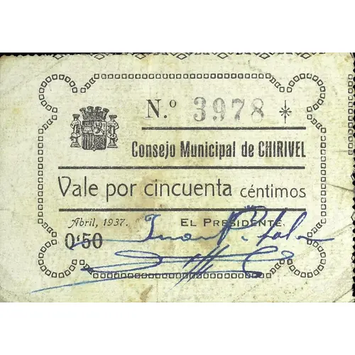 Consejo Municipal de CHIRIVEL Vale por cincuenta céntimos Abril, 1937. 0`50 (Translation: Municipal Council of Chirivel Valid for Fifty Centimos April 1937.) |