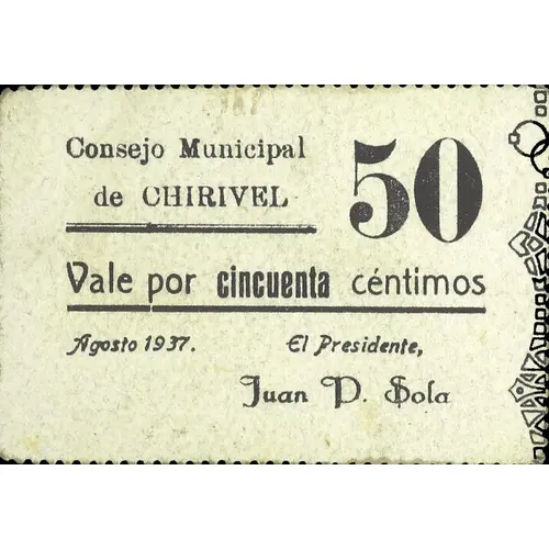 50 Consejo Municipal de CHIRIVEL Vale por cincuenta céntimos Agosto 1937. (Translation: Municipal Council of Chirivel Valid for Fifty Centimos August 1937.) |