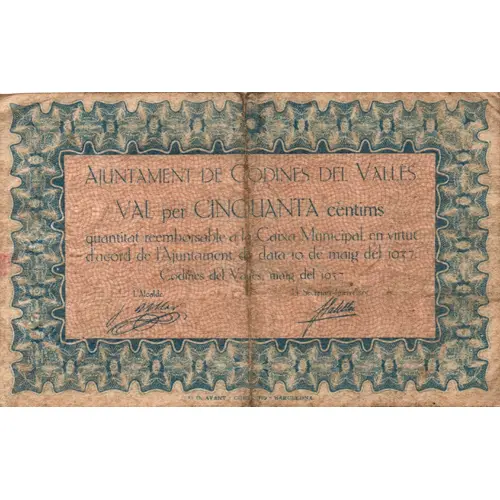 AJUNTAMENT DE CODINES DEL VALLÈS CINQUANTA cèntims quantitat reemborsable a la Caixa Municipal, en virtut d`acord de l`Ajuntament de data 10 de maig del 1937. Codines del Vallès, maig del 1937 (Translation: City Council of Codines del Vallès Fifty Centimos amount reimbursable to the `Caixa Municipal`, by agreement of the City Council dated May 10, 1937. Codines del Vallès, May 1937) |