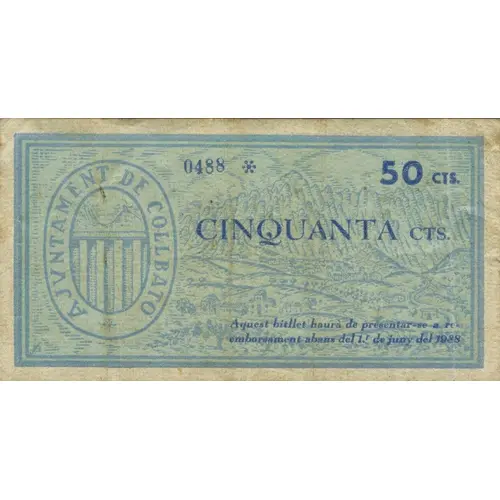 AJUNTAMENT DE COLLBATÓ 50 CTS. CINQUANTA CTS. Aquest bitllet haurà de presentar-se a reemborsament abans del 1r de juny del 1938 (Translation: City Council of Collbató 50 Centimos Fifty Centimos This banknote must be presented for reimbursement before June 1, 1938) |