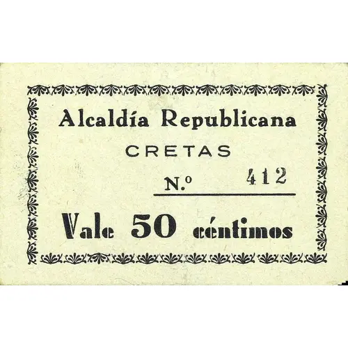 Alcaldía Republicana CRETAS Vale 50 céntimos (Translation: Republican Mayoralty Cretas Voucher 50 Centimos) |