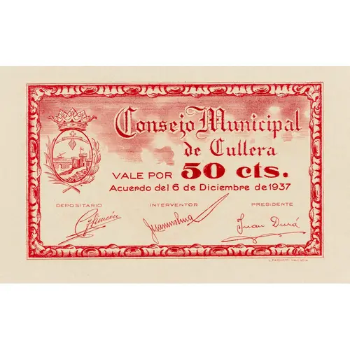 Consejo Municipal de Cullera VALE POR 50 cts. Acuerdo del 6 de Diciembre de 1937 (Translation: Municipal Council of Cullera Voucher for 50 Centimos Agreement of December 6, 1937) |