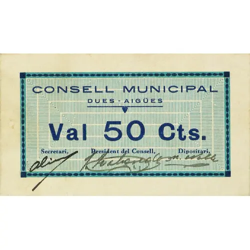 CONSELL MUNICIPAL DUES-AIGÜES Val 50 Cts. (Translation: Municipal Council Dues-aigües It`s worth 50 Centimos) |