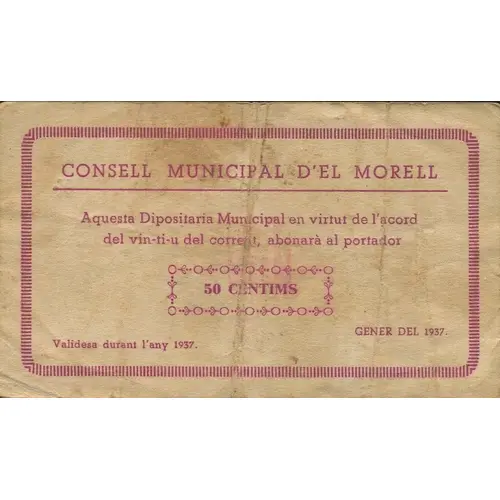 CONSELL MUNICIPAL D`EL MORELL Aquesta Dipositaria Municipal, en virtut de l`acord del vin-ti-u del corrent, abonarà al portador 50 CÈNTIMS GENER DEL 1937. Validesa durant l`any 1937. (Translation: Municipal Council of El Morell This Municipal Depository, by virtue of the agreement of the twenty-one of current, will pay to the bearer 50 Centimos January 1937. Validity during the year 1937.) |