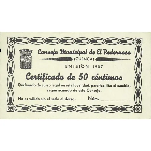 | Obverse lettering | Consejo Municipal de El Pedernoso (CUENCA) EMISIÓN 1937 Certificado de 50 céntimos Declarado de curso legal en esta localidad, para facilitar el cambio, según acuerdo de este Consejo. No es válido sin el sello al dorso. (Translation: Municipal Council of El Pedernoso (Cuenca) Issue 1937 50 Centimos certificate Declared legal tender in this locality, to facilitate the change, according to the agreement of this Council. Not valid without the stamp on the back.) |
