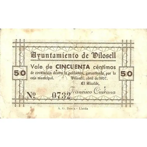 Ayuntamiento de Vilosell Vale de CINCUENTA céntimos de circulación dentro de la población, garantizado por la caja municipal. Vilosell, abril de 1937 (Translation: City Council of Vilosell Voucher of Fifty Centimos circulation within the town, guaranteed by the municipal fund. Vilosell, April 1937.) |