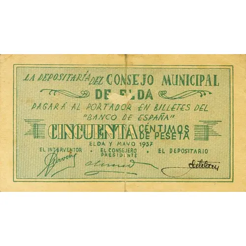 LA DEPOSITARÍA DEL CONSEJO MUNICIPAL DE ELDA PAGARÁ AL PORTADOR EN BILLETES DEL `BANCO DE ESPAÑA` CINCUENTA CÉNTIMOS DE PESETA ELDA Y MAYO 1937 (Translation: The Depositary of the Municipal Council of Elda Will pay the bearer in banknotes of the `Bank of Spain` Fifty Centimos of Peseta Elda and May, 1937) |