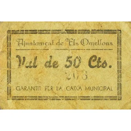 Ajuntament de Els Omellons Val de 50 Cts. GARANTIT PER LA CAIXA MUNICIPAL (Translation: City Council of Els Omellons Voucher of 50 Centimos Guaranteed by the `Caixa Municipal`) |