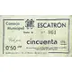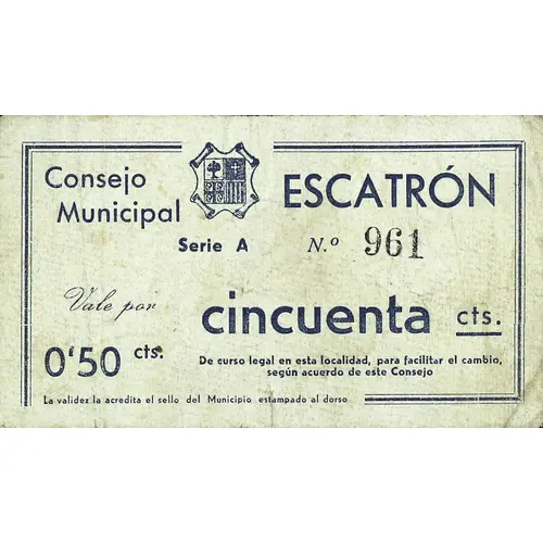 | Obverse lettering | Consejo Municipal ESCATRÓN Vale por 0`50 cts. cincuenta cts. De curso legal en esta localidad, para facilitar el cambio, según acuerdo de este Consejo La validez la acredita el sello del Municipio estampado al dorso (Translation: Municipal Council Escatron Voucher for 0.50 Centimos Fifty Centimos Legal tender in this locality, to facilitate the exchange, according to the agreement of this Council Validity is confirmed by the stamp of the Municipality stamped on the back) |