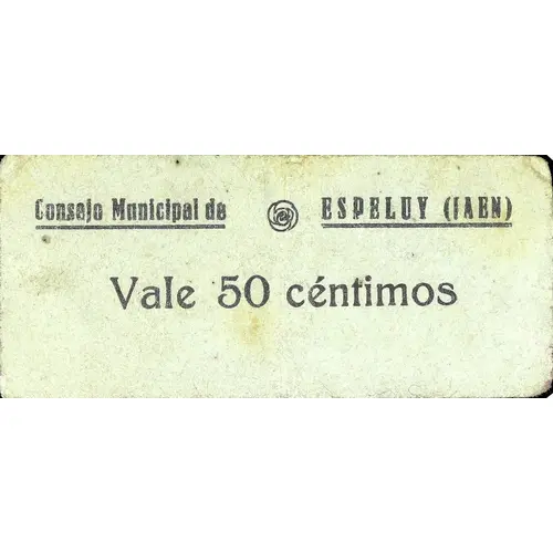 | Chữ khắc mặt trước | Consejo Municipal ESPELUY (JAEN) Vale 50 céntimos (Translation: Municipal Council Espeluy (Jaen) It`s worth 50 Centimos) |