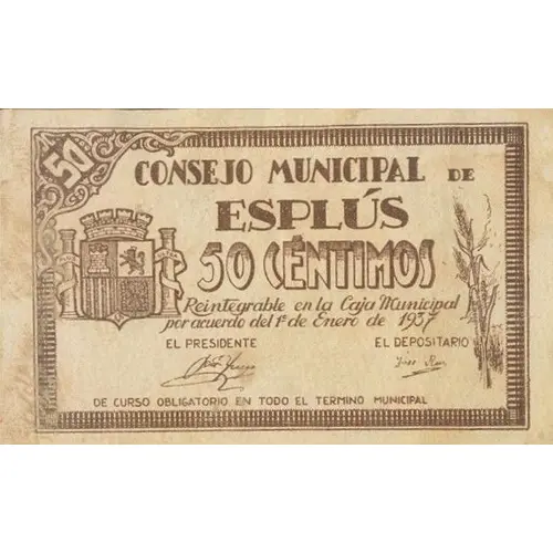 CONSEJO MUNICIPAL DE ESPLÚS 50 CÉNTIMOS Reintegrable en la Caja Municipal por acuerdo del 1º de Enero de 1937 DE CURSO OBLIGATORIO EN TODO EL TERMINO MUNICIPAL (Translation: Municipal Council of Esplus 50 Centimos Reimbursable in the Municipal Fund by agreement of January 1, 1937 Mandatory course throughout the Municipal term) |