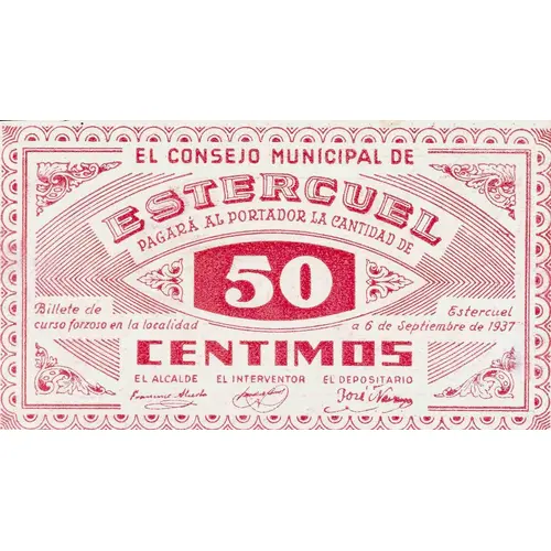 EL CONSEJO MUNICIPAL DE ESTERCUEL PAGARÁ AL PORTADOR LA CANTIDAD DE 50 CENTIMOS Billete de curso forzoso en la localidad Estercuel a 6 de Septiembre de 1937 (Translation: The Municipal Council of Estercuel Will pay the bearer the amount of 50 Centimos Mandatory course banknote in the municipality Estercuel, September 6, 1937) |
