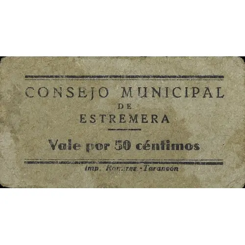 CONSEJO MUNICIPAL DE ESTREMERA Vale por 50 céntimos Imp. Ramírez. - Tarancón (Translation: Municipal Council of Estremera Voucher for 50 Centimos) |