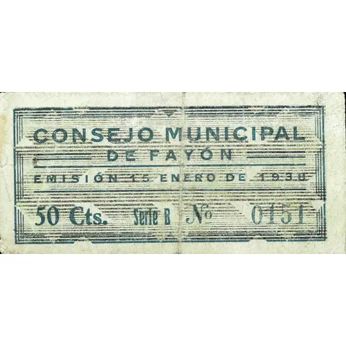 El Consejo Municipal de Fayón ha creado este Papel Moneda con el solo objeto de facilitar las transacciones dentro del Pueblo Fayón a 15 de Enero de 1938. VALOR 50 Cts. (Translation: The Municipal Council of Fayón has created this Paper Money with the sole purpose of facilitating transactions within the Town Fayon on January 15, 1938. Value 50 Centimos) |