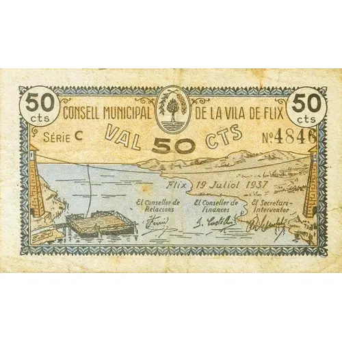50 cts CONSELL MUNICIPAL DE LA VILA DE FLIX VAL 50 CTS Flix 19 Juliol 1937 (Translation: 50 Centimos Municipal Council of the town of Flix Voucher 50 Centimos Flix, July 19, 1937) |