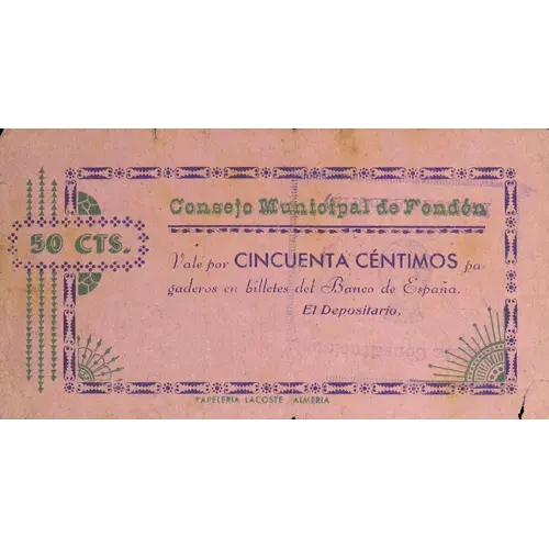 Consejo Municipal de Fondón 50 CTS. Vale por CINCUENTA CÉNTIMOS pagaderos en billetes del Banco de España. PAPELERIA LACOSTE - ALMERIA (Translation: Municipal Council of Fondón 50 Centimos It is worth Fifty Centimos payable in Bank of Spain notes.) |