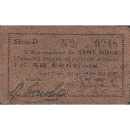 L`Ajuntament de SANT GUIM (Estació) pagarà al portador d`aquest VAL 50 Cèntims. Sant Guim, 17 de Maig del 1937. (Translation: The City Council of Sant Guim (Estació) will pay the bearer of this Voucher 50 Centimos. Sant Guim, May 17, 1937.) |