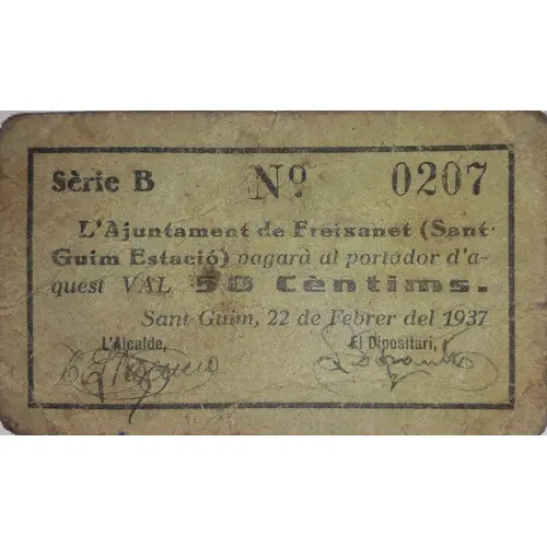 L`Ajuntament de Freixanet (Sant Guim Estació) pagarà al portador d`aquest VAL 50 Cèntims. Sant Guim, 22 de Febrer del 1937. (Translation: The City Council of Freixanet (Sant Guim Estació) will pay the bearer of this Voucher 50 Centimos. Sant Guim, February 22, 1937.) |