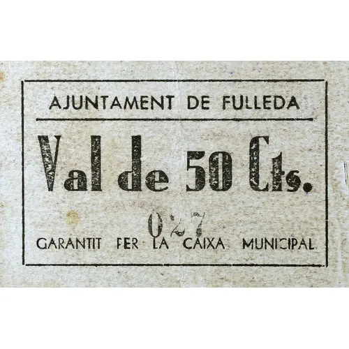 AJUNTAMENT DE FULLEDA Val de 50 Cts. GARANTIT PER LA CAIXA MUNICIPAL (Translation: City Council of Fulleda Voucher of 50 Centimos Guaranteed by the Municipal Fund) |