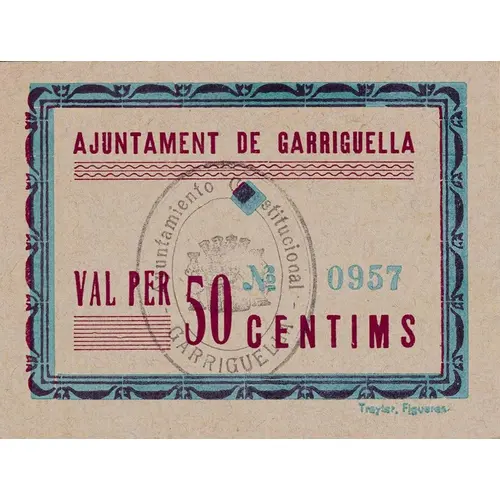(Translation: City Council of Garriguella Valid for 50 Centimos)