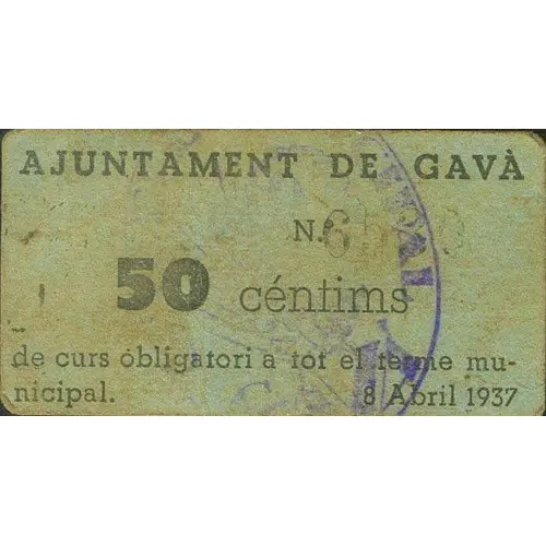 AJUNTAMENT DE GAVÀ 50 céntims de curs obligatori a tot el terme municipal 8 Abril 1937 (Translation: City Council of Gavà 50 Centimos of mandatory course in all municipal term. April 8, 1937) |